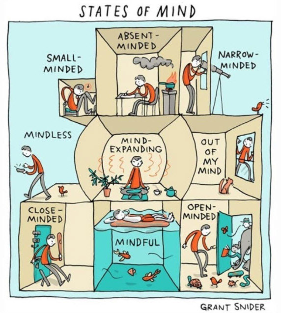 We really love this graphic from Grant Snider. Where is our mind at today? The key is not attaching to any one state. As with our thoughts, all of our states of mind are transient.